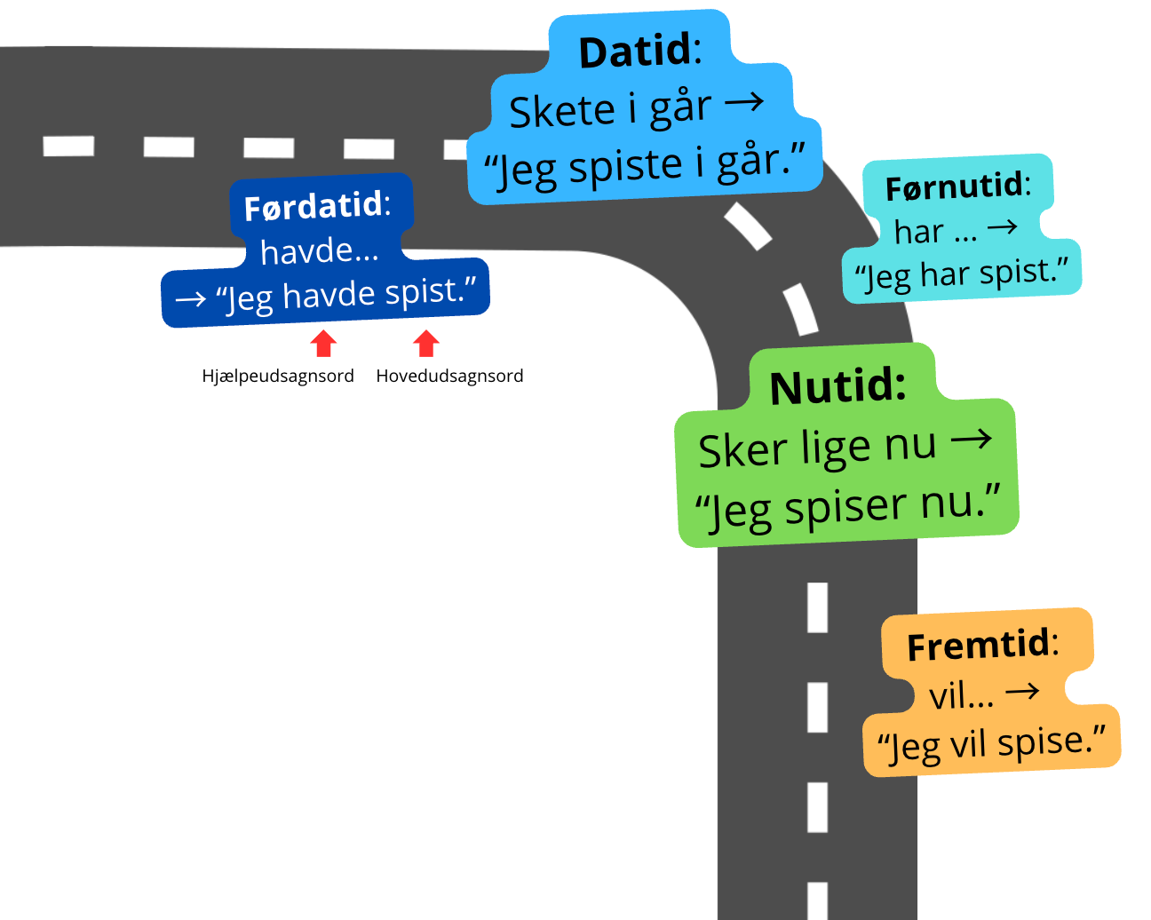 - at spise– at drikke– at være– at gøre– at gå– at have– at sige– at kunne– at ville